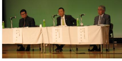 【シンポジウム】 『地域振興、地域輿しを語る』 パネラー 西本 和馬 氏(岡山県商工会連合会 会 長) 桑田 真治 氏(おかやま信用金庫 理事長) 司会 馬場 勉 氏(おかやま適塾 塾 長) |