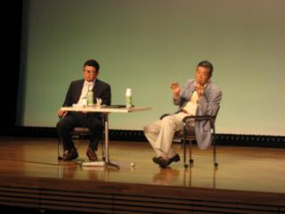 二部は、一服した後に、一部に引き続き 坂口さんを中心に、質疑応答を交えて愉快に 会話(トーク)をします おかやま適塾 塾長 馬場 勉(司会) |